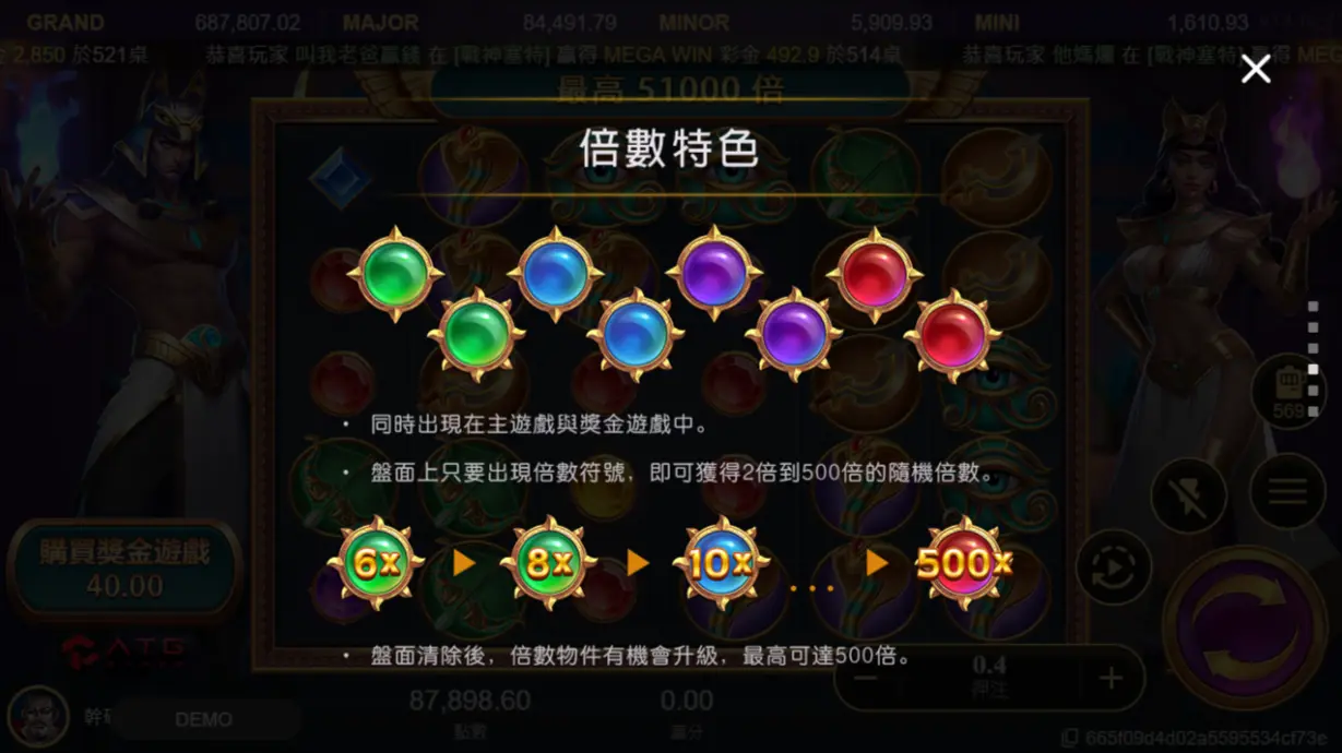 戰神賽特2盤面會隨機出現 2 倍至 500 倍不等的倍數符號。當盤面停止擴展或連鎖結束後,這些倍數將進行累加,再乘上當前累積獎金,形成更高的最終回報。這種倍率疊加設計,也是二代最核心的高爆分特色之一。